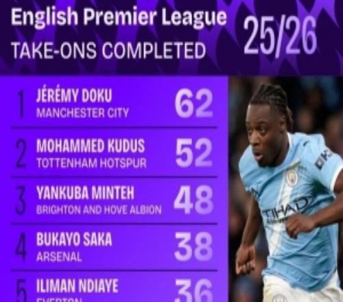本赛季英超成功过人排名:多库62次居首,库杜斯、明特、萨卡前四